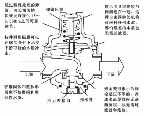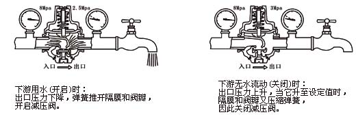 出(chu)口壓力(li)作用在(zai)隔膜底(di)面和閥(fa)瓣底面(mian),當它超(chao)過彈簧(huang)設定值(zhi)時,壓縮(suo)彈簧,使(shi)閥瓣關(guan)閉。隻要(yao)下 遊無(wu)水流動(dong),出😥口壓(ya)力将基(ji)本保持(chi)在設定(ding)值(其變(bian)化量僅(jin)爲入口(kou)壓力變(bian)化良的(de)8%);當下💕遊(you)用水😮💨時(shi),出口壓(ya)力下降(jiang),彈簧推(tui)開隔膜(mo),打開減(jian)壓閥。水(shui)流連續(xu)流通一(yi)陣後,減(jian)壓閥的(de)開啓産(chan)生自阻(zu)尼效應(ying),使啓閉(bi)動作趨(qu)于平穩(wen)。